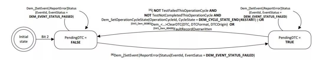PendingDTC用于表示故障在当前运行循环或者上一个运行循环出现过testFailed被置位为1,并且PendingDTC的状态只有在当前循环测试完毕之后才会更新。也就是说,如果上一个循环故障发生了,PendingDTC置1,当前循环故障没有发生,但是PendingDTC仍为1,只有在下一个循环才会恢复为0。该位恢复0的条件有两种: