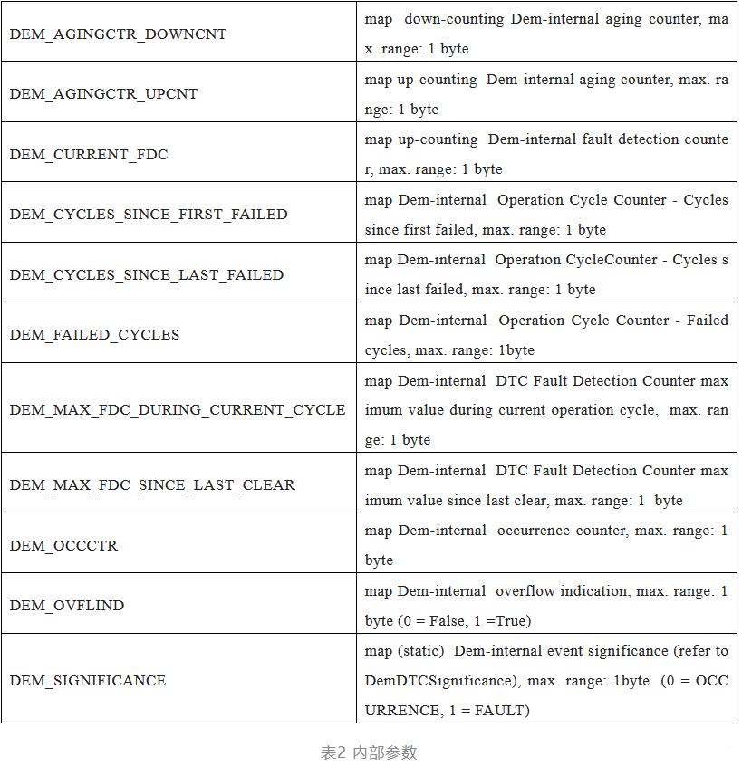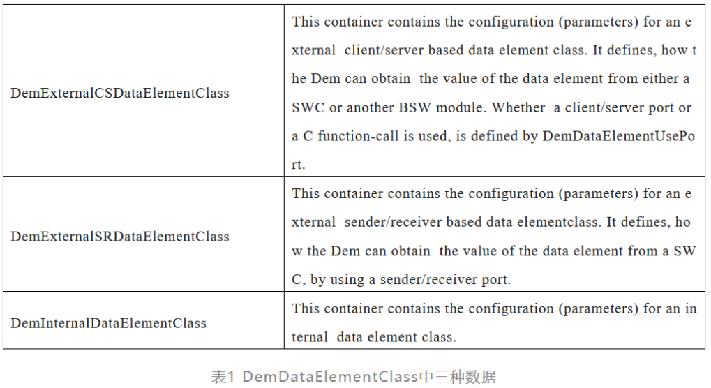 DemDataElementClass 其中内部元素如表2所示,外部元素主要分通过C/S或S/R接口获取应用层的数据。