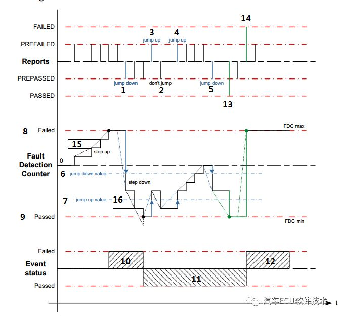 - DemDebounceCounterFailedThreshold:从预故障状态跳转到故障状态的阈值。