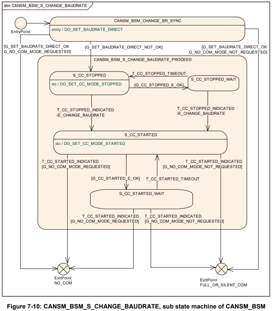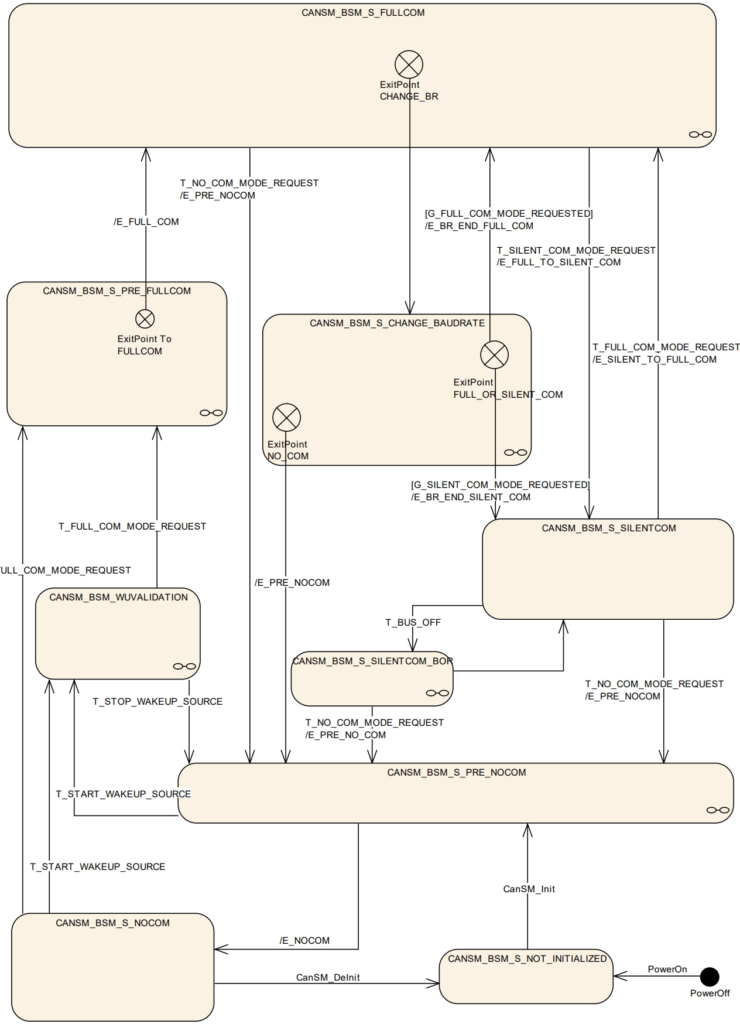 • CanSM状态机在一级层面上分为:NO_COMMUNICATION, PRE_NO_COMMUNICATION, WAKEUP_VALIDATION,PRE_FULL_COMMUNICATION,FULL_COMMUNICATION,SLIENT_COMMUNICATION,CHANGE_BAUDRATE,7个子状态;