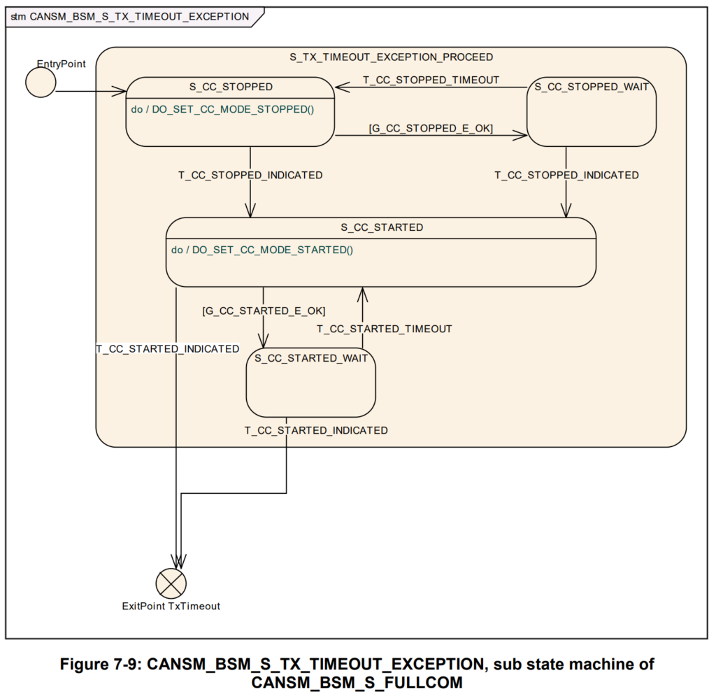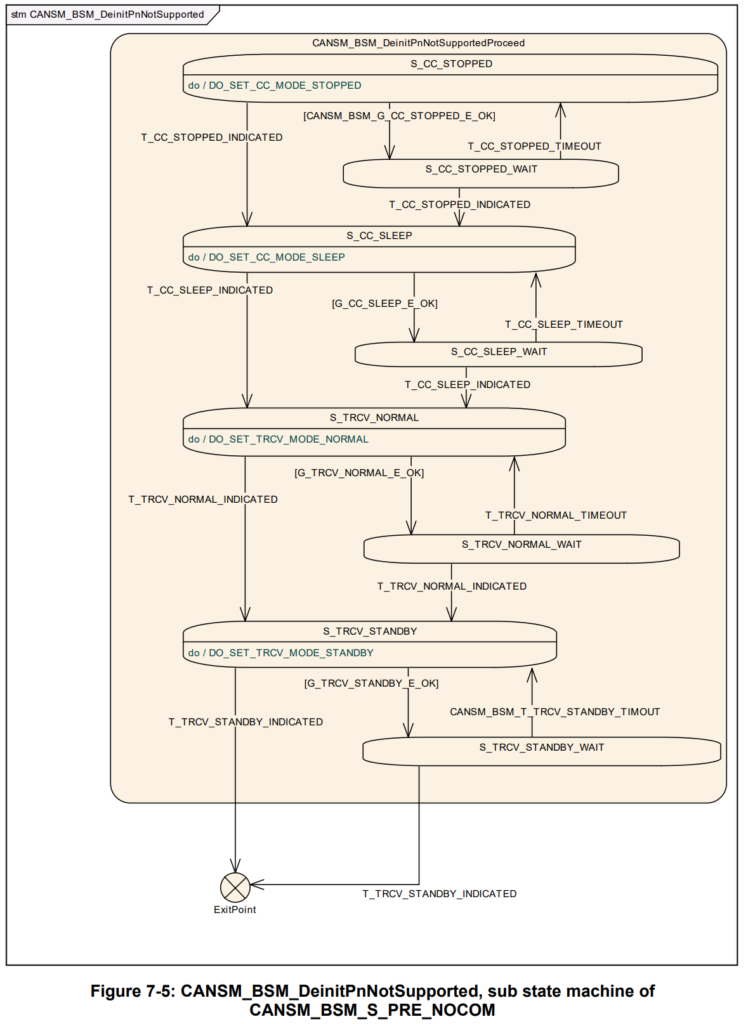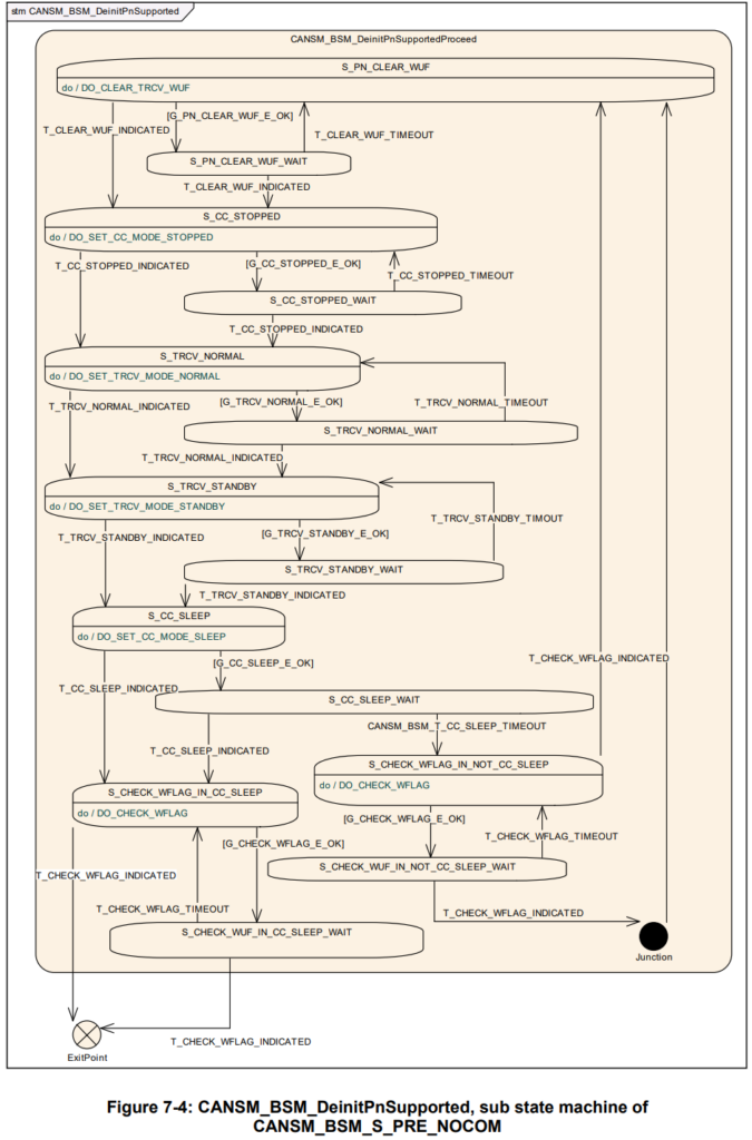 如果状态S_CC_STOPPED中的所有API调用都返回了E_OK,则应通过子状态机CANSM_BSM_DeinitPnSupported的保护条件G_CC_STOPPED_E_OK。
