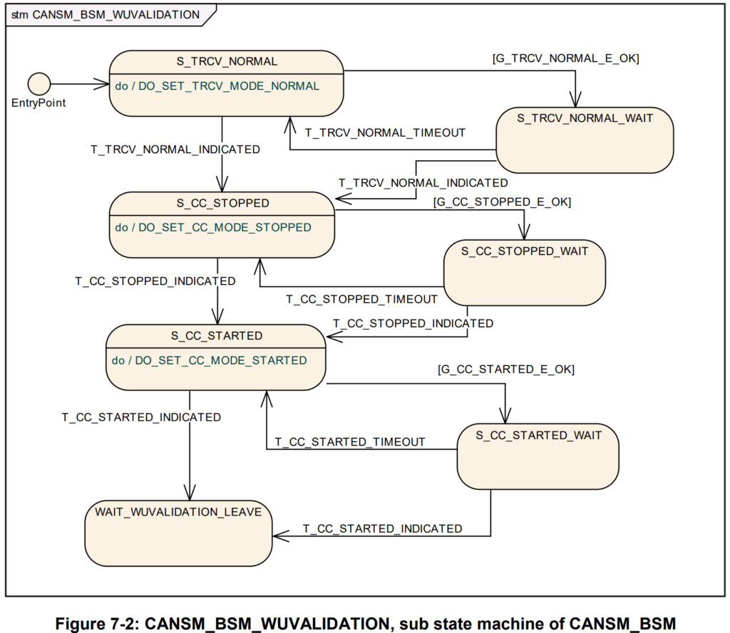 如果API请求 CanSM_StartWakeUpSource返回E_OK,将会以参数T_START_WAKEUP_SOURCE触发CanSM状态机,跳转进入CANSM_BSM_WUVALDATION状态。