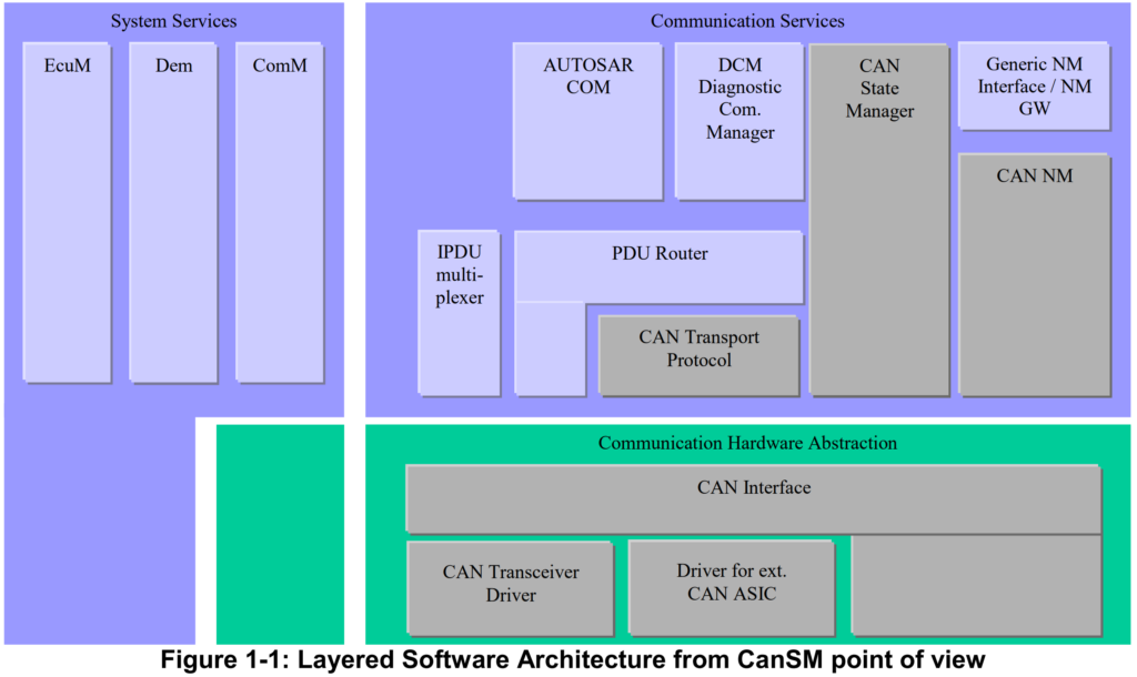 CAN状态管理器(CAN State Manager,CanSM)。CanSM位于BSW的通信服务层,它与通信硬件抽象层和系统服务层交互。下图所示为CanSM在AUTOSAR BSW中的位置。
