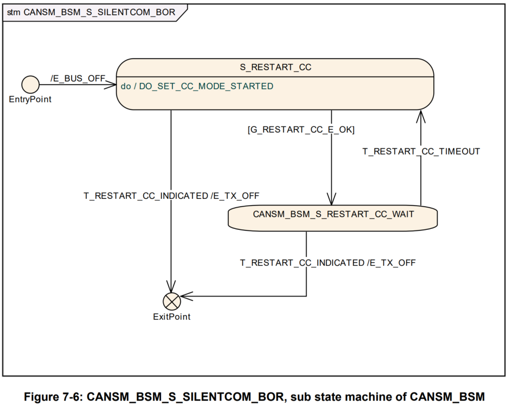 如果状态S_RESTART_CC的所有API调用都返回E_OK,则应通过子状态机CANSM_BSM_S_SILENTCOM_BOR的保护条件G_RESTART_CC_OK。